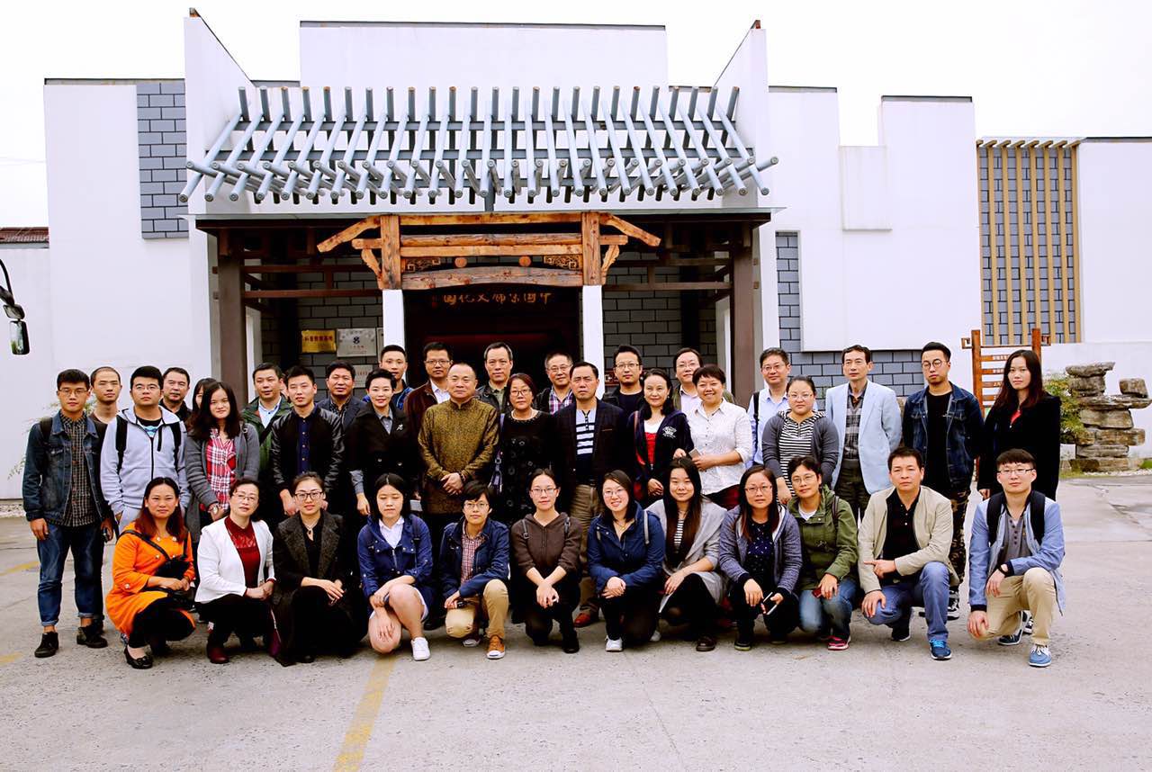 鼎盛丝绸董事长吴建华与苏豪传媒副总经理单凤艳率参展团在中国宋锦文化园前合影